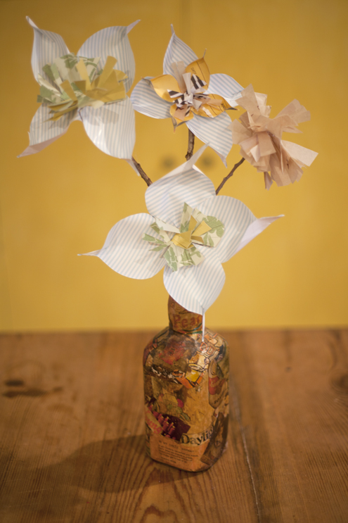 All you do is cut out some flower shapes and glue the tips together of each petal to make them 3-D. They can be made in a million different ways, so just have fun with it!